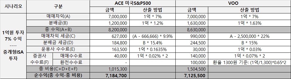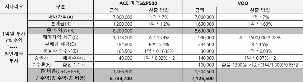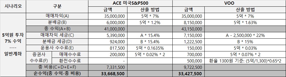 1억원 투자 7% 수익일 때는 ACE 미국S&P500이 순수익 면에서 압도적으로 패배했는데 5억원 투자 7% 수익이 되자 근소하지만 VOO를 이겨버렸다.