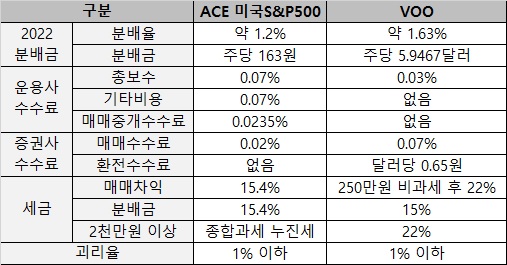 수수료 측면에서보자면 ETF 운용사 수수료에서 ACE미국 S&P500은 0.1635%, VOO는 0.03%로